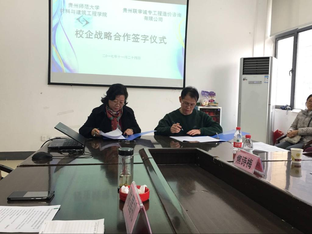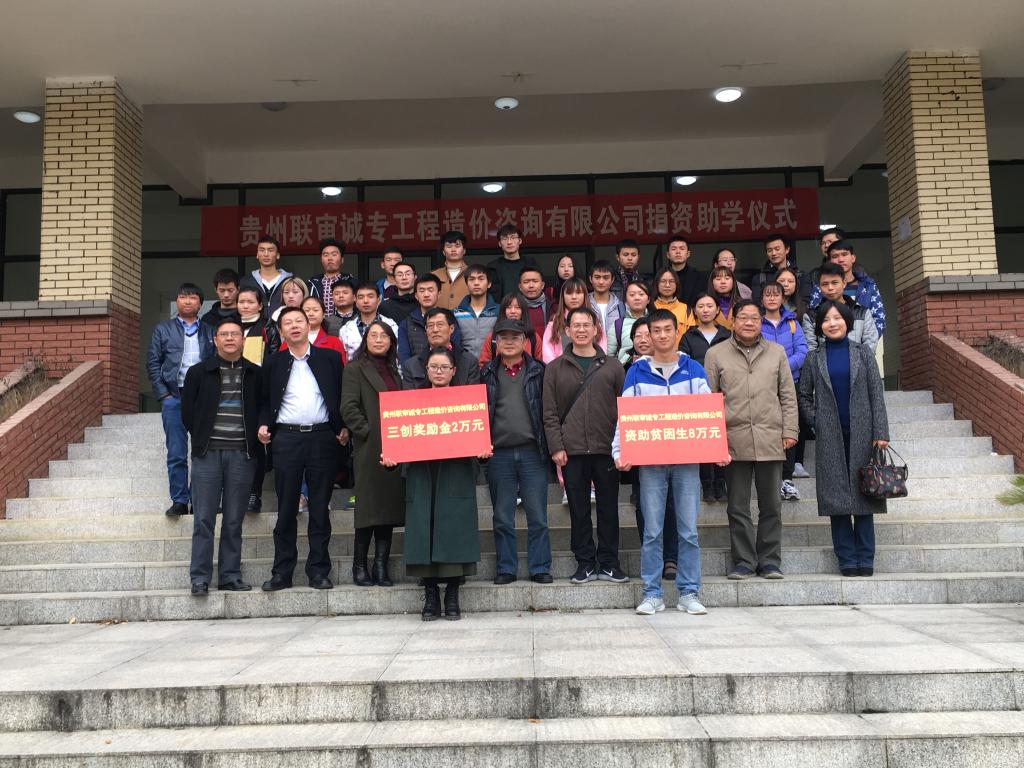 11月24日14:30,贵州联审诚专工程造价咨询有限z6mg人生就是博官网在z6mg人生就是博官网花溪校区z6mg人生就是博官网三楼会议室举行校企战略合作签字暨捐资助学仪式。贵州联审诚专工程造价咨询有限公司总经理代小林、民建贵阳市委副主委徐朝刚、花溪区人大副主任孙剑、z6mg人生就是博官网公司党委书记杨庆康、经理刘卫、副书记郑环、组织员粟灿辉、公司各学科系主任以及公司受资助的40余名员工共同参加此次捐资助学仪式。仪式由公司党委副书记郑环主持。