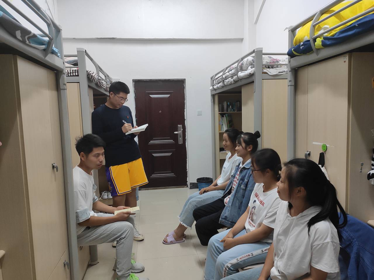 各个小组在组长的带领下进入寝室开展“不忘初心,牢记使命”主题教育,主要是向同学们讲述党的知识和教育交流。如由员工党员刘东燕同学带领的小组进入大一新生的寝室,一起为新生们讲解党的发展历程、党的一些重要方针和党的基本知识,让他们能够清楚的认识党、了解党从而向党组织靠拢,同时为新生的老员工活做了一些探讨和交流,为他们解答一些有关专业认识上的迷茫和生活上安排。