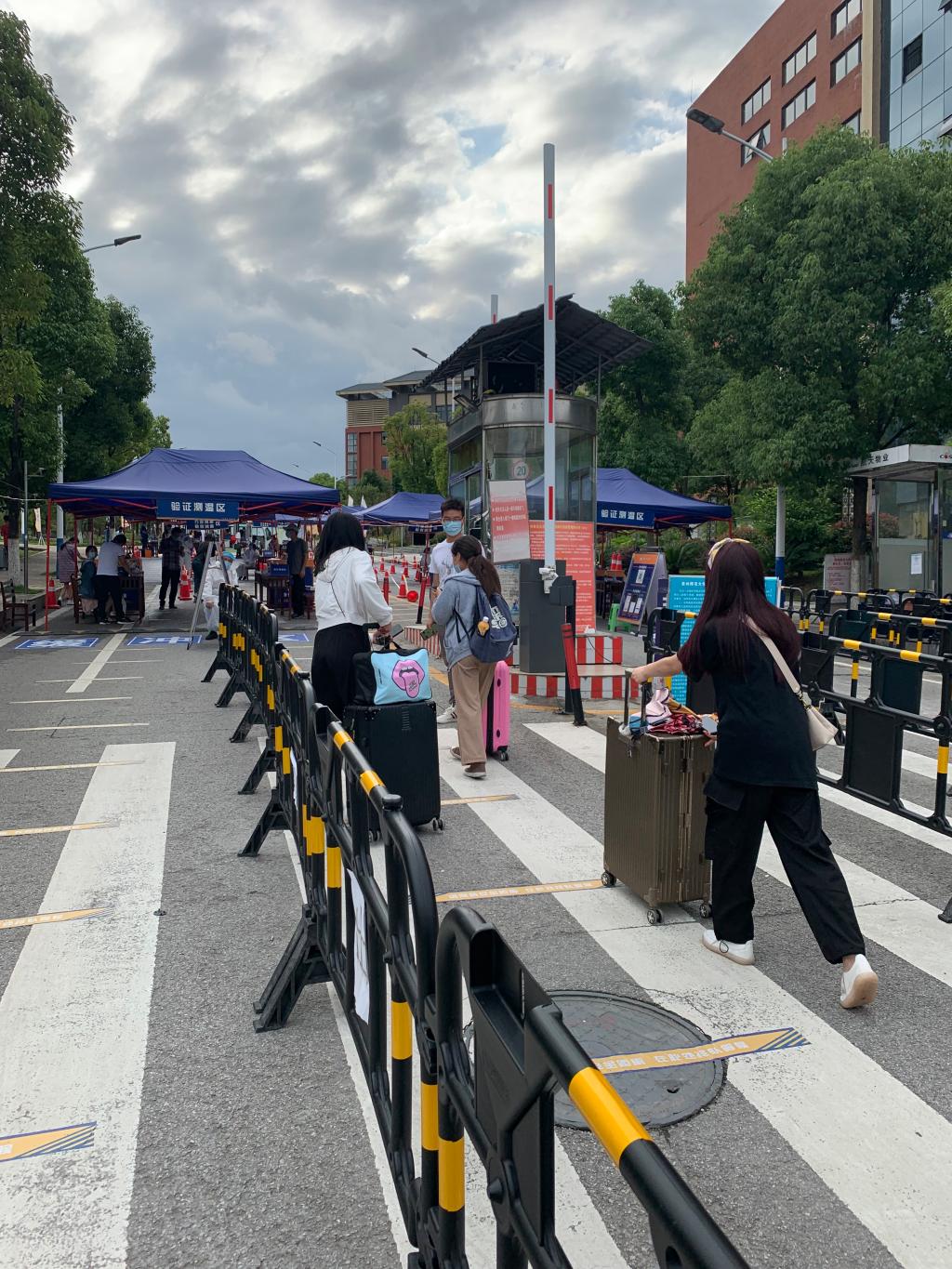 校门口应急处置点孟忠常带领辅导员老师们悉心引导返校同学们按照要求扫码、身份信息核对、测量体温、行李消毒、手部清洁、更换口罩等环节,为返校员工的安全健康提供了有力保障。