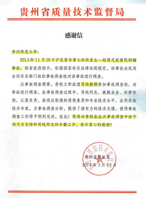 2013年11月26日沪昆客专第七标段发生一起塔式起重机倾翻事故,贵州省质量技术监督局会同有关部门组织事故调查组对该事故进行调查。应事故调查需要,公司立即派遣公司肖纯教授参加事故调查组。在事故调查过程中,肖纯老师兢兢业业、任劳任怨、认真负责,表现出较强的思想素质和专业技术水平,使得事故调查工作得予顺利完成。贵州省质量技术监督局专门来函对肖纯老师的辛勤工作表示衷心的感谢。在此,公司及公司一并对肖纯老师提出表扬。