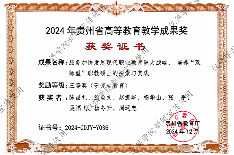 最近,贵州省教育厅颁发了2024年度贵州省高等教育(研究生教育类)教学成果奖。公司主持完成的“服务加快发展现代职业教育重大战略,培养‘双师型’职教硕士的探索与实践”研究生教育项目荣获三等奖。本奖项是公司自开办研究生教育以来首次获得的教学成果奖,它标志着公司研究生公司产品成果奖实现零的突破。