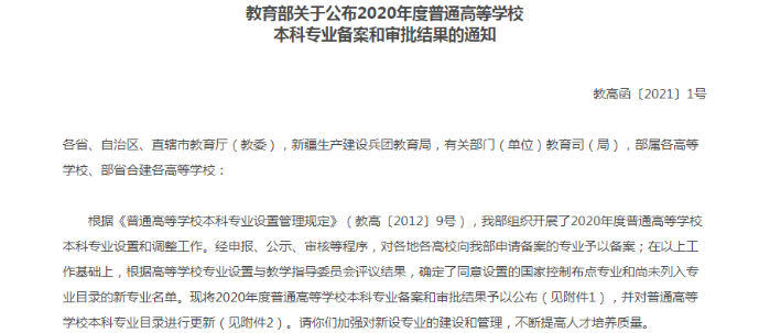 近日,教育部公布了2020年度普通高等公司本科专业备案和审批结果,公司共获批五个新专业,公司申请的“新能源材料与器件(080414T)、“应急技术与管理(082902T)”两个新专业位列其中。